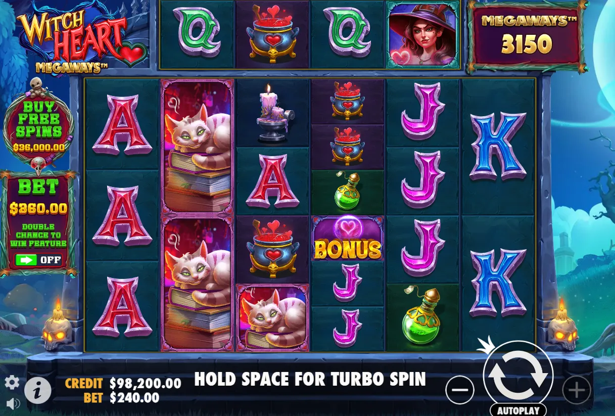 If patience isn’t your style, Witch Heart Megaways also offers a Feature Buy option. For a fixed cost of 150x your current bet, you can instantly trigger the free spins bonus round, bypassing the need to wait for scatters to land naturally. This feature is perfect for players who want immediate access to the game’s most exciting and potentially lucrative feature. The Feature Buy guarantees the appearance of 3, 4, 5, or 6 Bonus symbols, awarding the corresponding number of free spins. It’s a straightforward way to jump straight into the action and chase those big multipliers and explosive wilds that make Witch Heart Megaways so appealing.